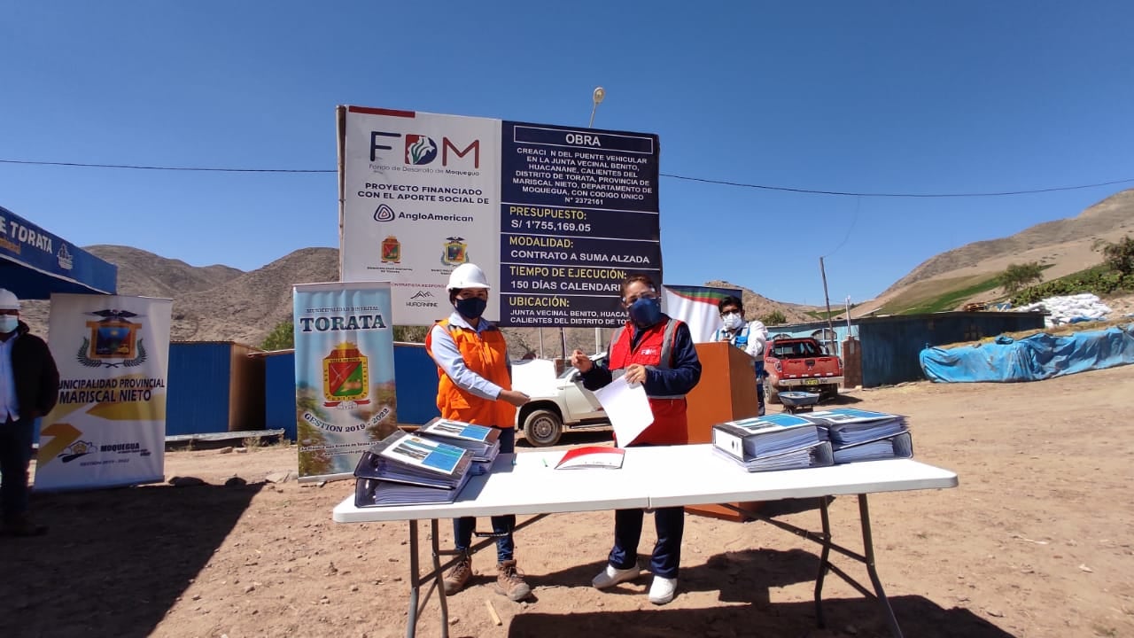 Con una inversión de S/ 1,755,169.05, financiada con recursos provenientes del adelanto de los S/ 100 millones como aporte por responsabilidad social de Anglo American Quellaveco y priorizada por el Consejo Directivo del Fondo de Desarrollo de Moquegua (FDM), se ejecutó el proyecto de creación del puente vehicular en la Junta Vecinal Benito Huacanane, anexo Calientes, en el distrito de Torata, provincia Mariscal Nieto.